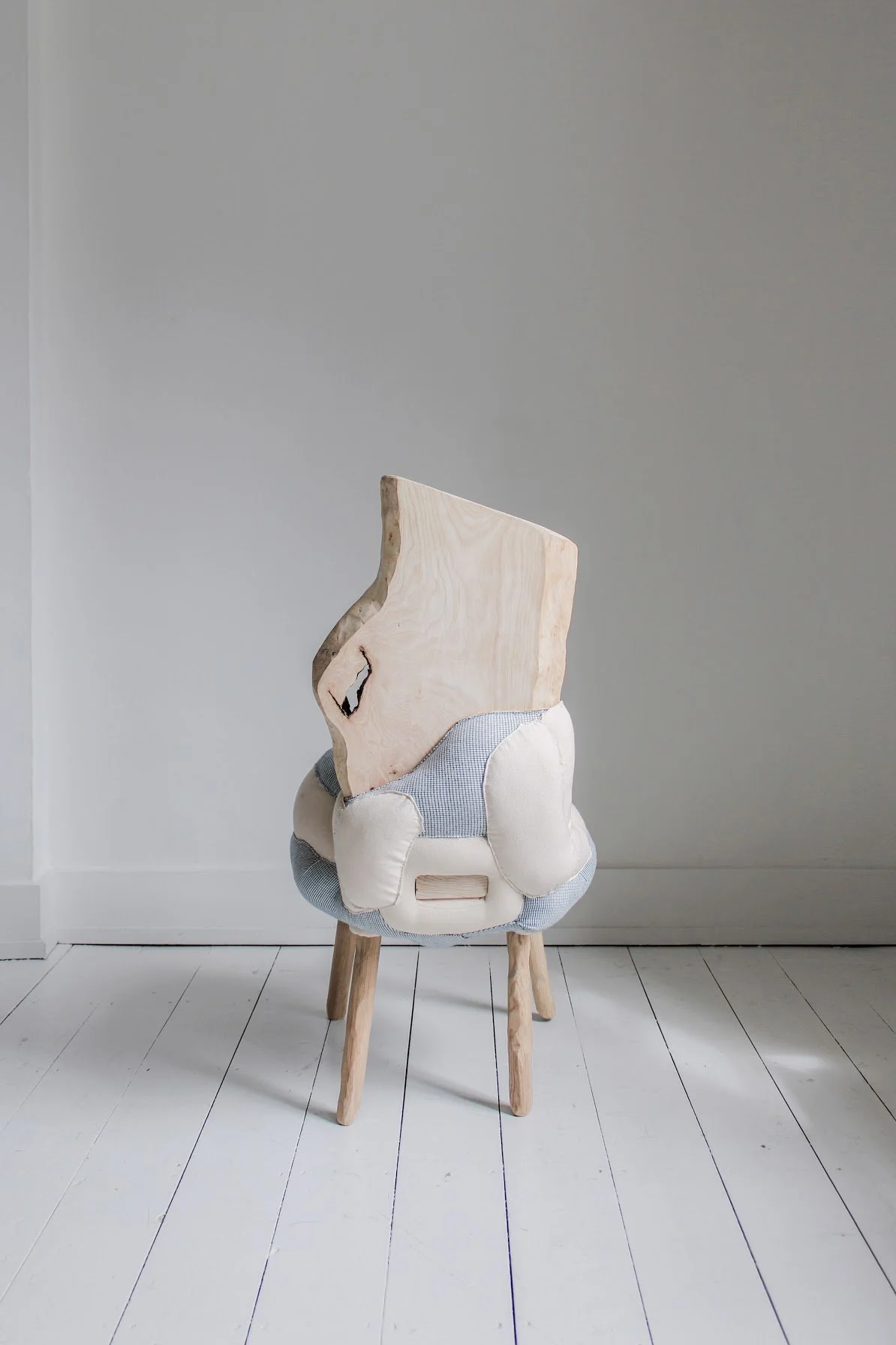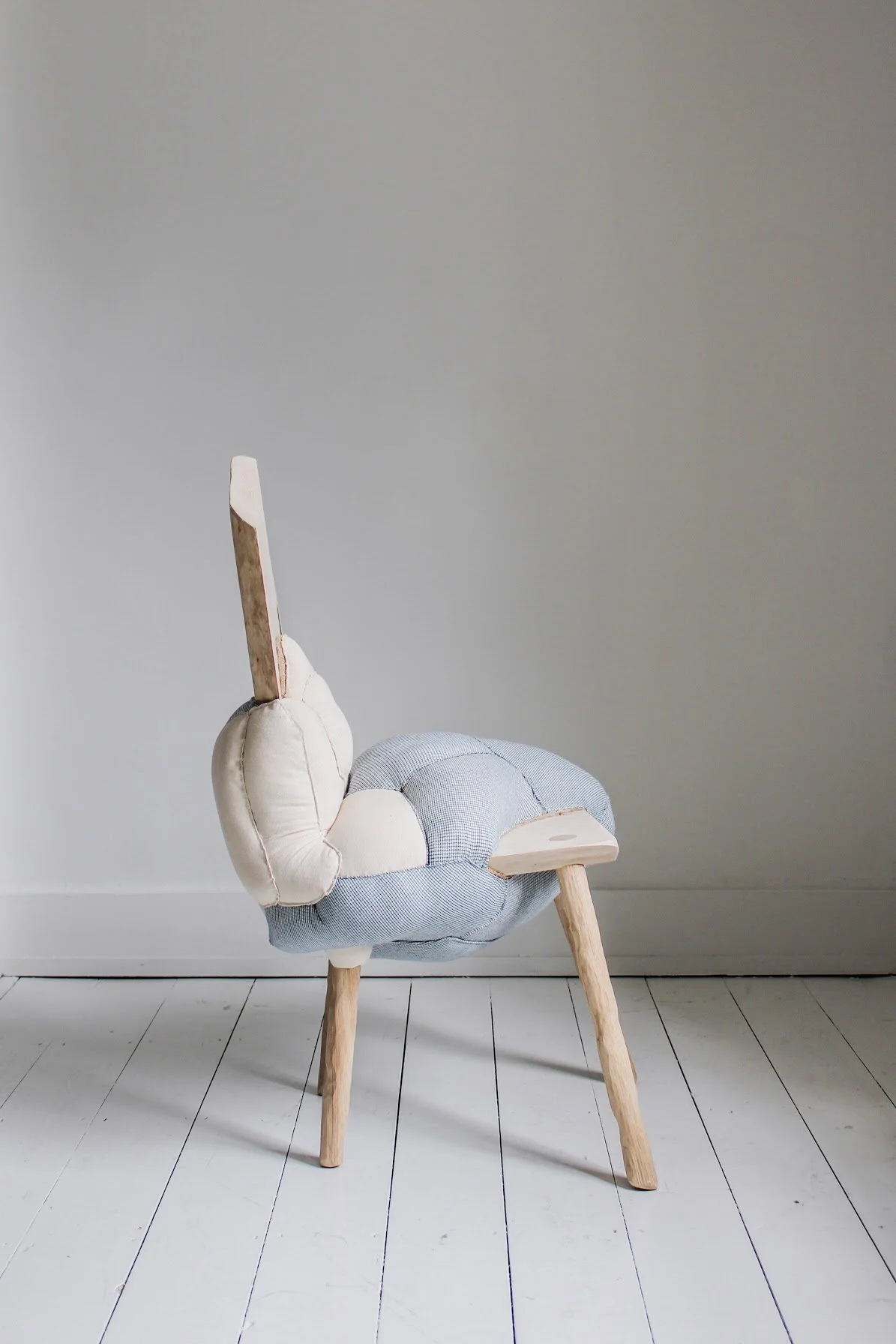 waney edge ash sourced in essex, recycled toy stuffing, blue dog tooth fabric, hessian and heavy recycled cotton
